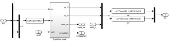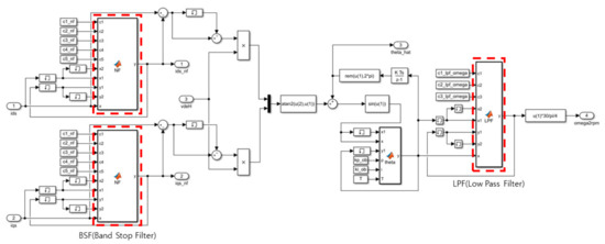 Figure 7 shows the blocks for estimating the rotor position and rotation speed. Figure 8 shows the internal configuration of the blocks in Figure 7. As shown in Figure 8, MATLAB function blocks were used for individual blocks to implement Equations (6)–(8) and bandstop filter (BSF). The filter part is implemented by discretizing the continuous terms, as done in [24]. The three-phase current containing harmonics is transformed into a two-phase current and passes through the BSF so that the harmonic part is detected, and the rotor position is estimated using the MATLAB function block that implemented Equation (7). LPF is used in measuring the phase currents to remove the harmonic current. The coefficient value of the BSF corresponds to the frequency of the injection voltage. In the case of Figure 7, is 1 kHz, and 100 Hz was applied as the bandwidth (B). Table 2 shows the specifications of the motor used in the simulation. The ratio of Ld and Lq is 2, and it is a setting to simulate the degree of saturation of harmonics following harmonic voltage injection.