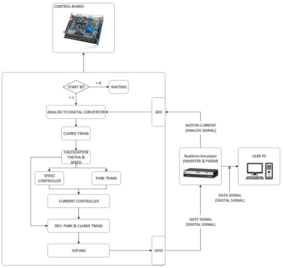 Figure 9 shows the HILS configuration in this study. VHDL was used to implement the 100 kHz PWM and sensorless algorithm, and the sensorless controller algorithm using harmonic injection was implemented in the FPGA controller. An inverter and a PMSM are modeled with Simulink and implemented in RT4510, a real-time simulator. The inverter and PMSM are operated in the real-time simulator, and the signals necessary for the controller are applied from the FPGA board. Meanwhile, the output from the control board to the real-time simulator is the gate signal of the inverter. The data designated by the user at the user PC are transmitted so that the user can monitor the system operation in HILs, and the resultant values are shown in a graph. In Figure 9, the flow diagram of the controller part is the same as the typical motor controller configuration.