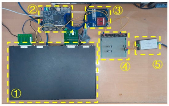 Figure 10 depicts a photo of the experimental equipment. Table 3 summarizes the names of individual devices. Device ③ is a board for matching the signal level between the control board ② and real-time OS ①, and devices ④ and ⑤ are the power supply for board ③. Meanwhile, the parameters of the PMSM used in HILS experiments are the same values as those used for the MATLAB simulation as shown in Table 2.