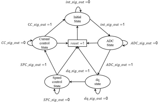 As illustrated in Figure 11, the sections were composed of a total of five level controllers: initial state, ADC state, dq state, speed-control state, and current-control state. In the initial state, the controller is in the standby state, and operates when an input is received. When the operation in each controller is finished, the start signal of the next controller is generated and the controller operates. When a series of operations is completed, the controller returns to the initial state and executes the series of operations again. If the RESET signal is input, all operations will be stopped regardless of which state the controller is in, and the operation will return to the initial state so that the controller waits for operation.
