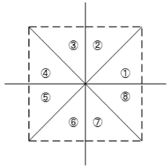 To obtain the position of the motor in Equation (7), the arc tangent should be calculated, and this is done using a lookup table. To utilize the limited memory space, a lookup table is constructed for values corresponding to 0° to 45°, and values corresponding to other angles are calculated through the characteristics of atan (arc tangent) values in eight areas as shown in Figure 12 [28,29]. The data sheet for atan IP core used in the Quartus prime tool is provided by Inter Co., and information about the atan IP core is provided in the data sheet. The adaptive lookup tables (ALUTs) that store atan2 values of the atan IP core store 2454 data. Since the atan2 interpolation method used in this study uses 450 data for each of the ALUTs, and the number of data corresponding to eight sectors is 3600. Therefore, it outputs more accurate data than the atan IP core [30].