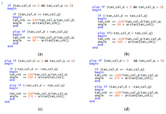 Figure 13a,b displays the codes that were implemented. Each figure illustrates the arc tangents implemented by calculation for each quadrant as shown in Table 4. A total of 100 lookup tables were constructed, and the formula for each sector is shown in Table 4. In the figure, tan_cal_d and tan_cal_q are the currents () in the state where the injection voltage was applied through the BSF, and tan_cnt is the address to find the data specified in the lookup table. When absolute values are taken for the sine and cosine values, the and values have the range of 45° and the large and small ones are changed. Through the foregoing, each quarter was divided by 45° to create eight areas. As shown in the codes by sector, the value of the numerator and the denominator were determined using the formulas in Table 4. In addition, when the value of one of and ) is negative, the value is multiplied by −1 so that only positive values are output as the values of tan_cnt. Since the LUTs value stored in advance is output after multiplying the tan_cnt value by 100, atna2 is implemented by interpolation.