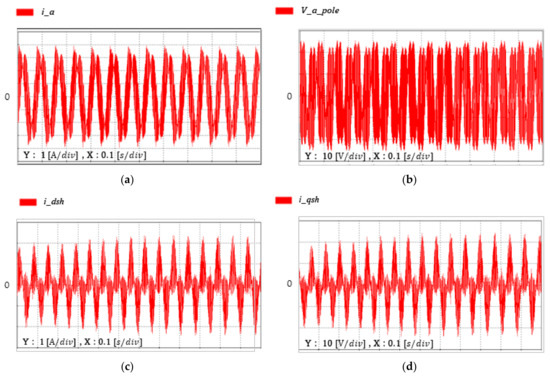 Through experiments, the rotor position detection performance of sensorless techniques for 200 Hz~10 kHz high-frequency injection voltage is examined when the PWM frequency is 100 kHz as with GaN devices. Figure 14 shows representative waveforms appearing when harmonics are injected. Figure 14a depicts the phase a current of the motor. Figure 14b shows that harmonics were added in the terminal voltage waveform. Figure 14c,d displays the d-axis and q-axis harmonic component current HILS experimental waveforms that passed through the BSF.