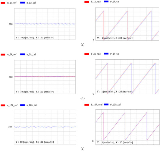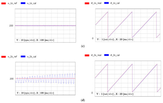 It can be seen that the errors in the angle estimation vary according to the magnitude of the frequency of the harmonic voltage, and that in cases where the error rate between the estimated speed and the command speed becomes larger when the frequency of the injection voltage becomes smaller or larger than 1 kHz. In cases where the switching frequency was , the command speed was followed well when the frequency of the harmonics was 10 kHz. It can be seen that the error in the estimated rotor angle was smaller than cases where the switching frequency was . In Figure 15, the red waveform (indicated by θ_x_real) is the actual position of the rotor, and the blue solid line (indicated by θ_x_cal) is the estimated position where x denotes the corresponding frequency of the injection voltage. In each waveform, the figure on the left shows the command speed and the calculated speed, and the figure on the right shows the estimated rotor angle and the actual rotor angle waveforms. The left figure of Figure 16d shows that the speed has a lot of ripple. That means the operating state of the motor is very unstable when operating at the 2 kHz injection frequency.