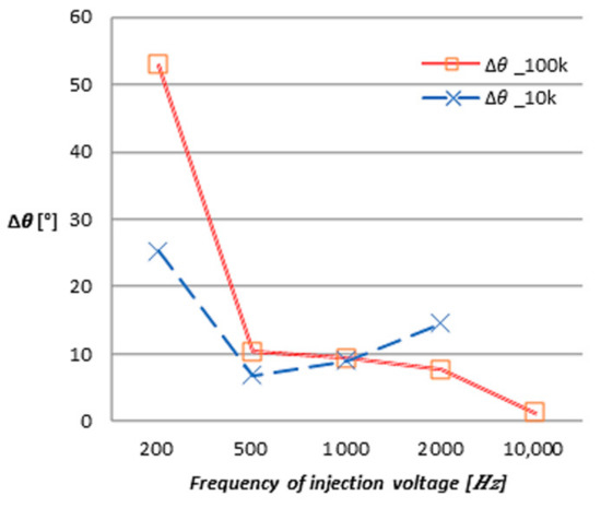 The x-axis is the frequency of the injection voltage, and the y-axis is Δθ (, which is measured at the moment when the actual angle of the rotor was changed from 2π radian to 0 radian. In the case of 10 kHz PWM, when the injection voltage frequency was 2000 Hz or higher, the angle error is 25.2°, indicating that the sensorless motor control was unstable. Therefore, there is no position error result for the 10 kHz injection voltage frequency because the speed control of the motor is not possible in the case of 10 kHz PWM.