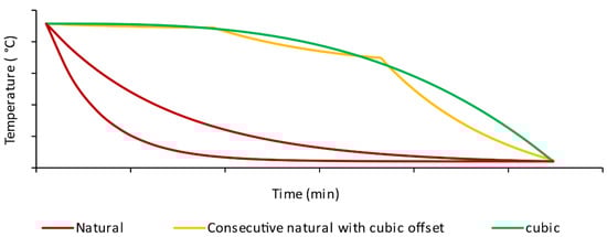 With T(t) the temperature profile, TI the initial temperature, TE the final temperature, t the time and the residence time. Figure 1 shows the cubic cooling profile along other common cooling profiles. Most crystallizers employ a natural cooling profile by placing the tubular crystallizer in a cooling bath as it is convenient. However, this results in one of the worst possible cooling profiles for a crystallizer as it is practically the opposite of a cubic cooling profile. Additionally, the profile is heavily dependent on the heat transfer rate, therefore there is little control over the profile. Some researchers try to employ a cubic cooling profile using several temperature baths in series with a cubic offset in temperature between these baths [20]. However, the temperature of the suspension cooled in these baths still follows a natural trajectory, thus the temperature decreases quickly when entering the temperature bath which results in supersaturation peaks [21,22]. This leads to fouling, agglomeration and secondary nucleation. Additionally, the other zones of the crystallizer will be used less effectively. Therefore, in order to optimally use the volume of a crystallizer, which is already small for tubular crystallizers, a cubic cooling profile is important and has potential to improve yields and operating times. However, as of thus far, a cubic cooling profile has not been achieved in a tubular crystallizer to our knowledge and it is far from easy to obtain.