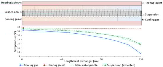Design of the heat exchanger and the obtained temperature profiles in the heat exchanger. Note that the expected suspension profile is a proportional projection of the cooling gas profile.