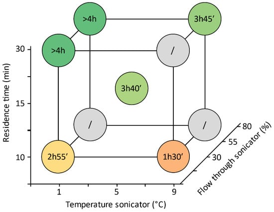 A 23 design of experiments (DOE) was performed in order to find the optimal working conditions of the crystallizer and evaluate the influence of 3 parameters on the crystallization process. The first parameter that was varied was the temperature in the sonicator or nucleator, which was set at 1 °C and 9 °C for the low and high setting respectively. More specifically, it was the temperature of the cooling water that flows around the tube that was varied. The second parameter is the percentage of the total flow that goes through the sonicator. The flow goes either through the sonicator or through the pulsator. The high and low setting were 30% and 80%, respectively. The final parameter that was varied was the total flow rate, which is inversely proportional to the residence time in the crystallizer. The high and low setting were 45 mL/min and 15 mL/min respectively, which correspond to a residence time of 31 and 10 min in the heat exchanger, respectively. The center point of the DOE was measured using a sonicator temperature, percentage of flow going through the sonicator, flow rate and residence time of 5 °C, 55%, 30 mL/min and 15 min, respectively. Several criteria were used to evaluate the crystallization process; first, the operating time, which is the time until clogging, which was evaluated up to 4 h. Second, the time until fouling is observed, which is subjective but does give information. Third, images of the crystals were evaluated visually online and offline and particle size distributions were measured. The inline images were taken each second and the offline images were taken by suspending a small amount of filtered adipic acid into heptane with lecithin. Finally, the yield was measured using three methods: the remaining supersaturation in the liquid, the mass of crystals formed in a set amount of time and the sum of volumes that was determined under the microscope. The sum of volumes determines the volume of crystals under the microscope by assuming all particles are spheres, calculating their volume using the spherical equivalent diameter and adding up all volumes [25].