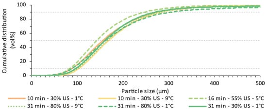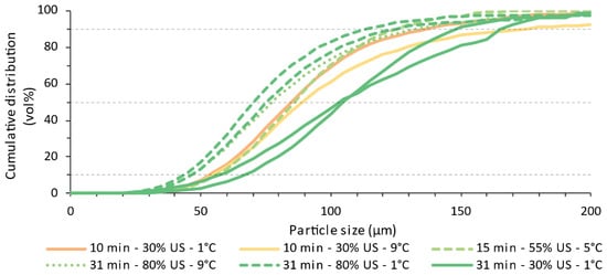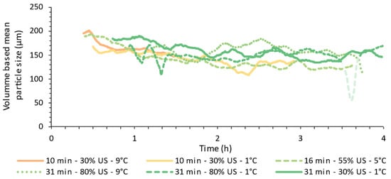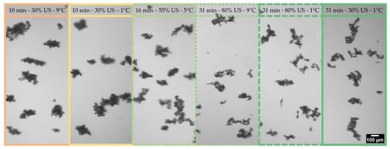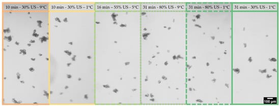 Figure 8 shows images of the filtered crystals suspended in heptane with lecithin as a surfactant. Adipic acid disperses better in heptane, therefore, these images give more information about the degree of agglomeration of the crystals. The images show that the crystals are clearly less agglomerated after suspension in heptane, thus, establishing that sizeable parts of the agglomerated are only loosely connected. Conversely, as the crystals are still quite agglomerated in heptane, it also means a sizeable part of the crystals are hard agglomerates. Overall, there are little visual differences between the images, only the experiment with the shortest operating time (10 min—30% US—9 °C) shows slightly more agglomeration than the other experiments, this would not be unexpected as it clogged the earliest.