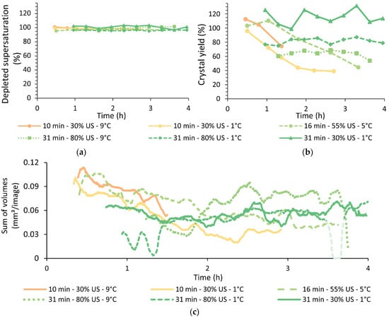 Evolution of yield, relative to the solubility, during the experiments using different methods. (a) The yield based on the amount of supersaturation depleted. (b) The yield based on the mass of crystals collected. (c) The sum of volumes, which measures the volume of particles under the microscope and is used to follow up the yield qualitatively.