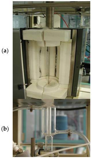 Photos of the designed bench-scale reaction units: (a) quartz tubular reactor and its furnace with upstream, the mixing/preheating unit (quartz annular exchanger surrounded by a roll of heating resistances); (b) quartz annular fast-quenching system (downstream the tubular reactor).