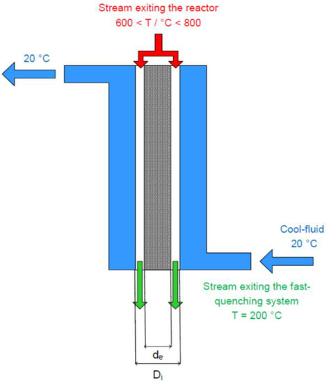 The objective of the fast-quenching system is to cool the reactive gas mixture leaving the reactor almost instantaneously from 600 to 200 °C. This assumes that the time required for this operation be much smaller than the residence time of the feed stream inside the reactor. Thus, one could reasonably assume that the thermal reaction process only occurs inside the reactor and, therefore, is definitely stopped at the outlet. Within this context, the selected system was a quartz heat exchanger with an annular cross section where the heat would be transferred from the reacting fluid flowing inside the annular space to the outside wall. In practice, the heat exchanger (Figure 3) consisted of a central tube enclosed in a double-shell (two concentric pipes) in which the cool-fluid flows counter-currently to the warm-fluid and is maintained at low temperature (20 °C; Section 2.4). Within this geometric configuration, the annular space is then formed by the empty volume between the wall of the central tube (diameter ) and the inside wall of the double-shell inner pipe (internal diameter , length L).