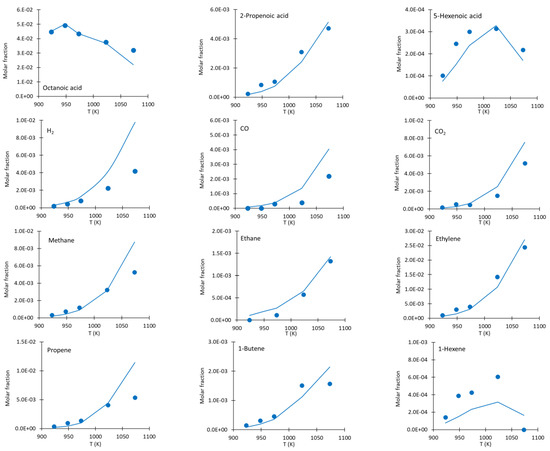 Reactant and key product mole fraction profiles versus oven set point temperature resulting from octanoic acid pyrolysis carried out in the bench-scale setup designed in this work. The mole fraction profiles obtained for the oven set temperature 973.15 K come from this work (Table 5), while the others come from reference [13].