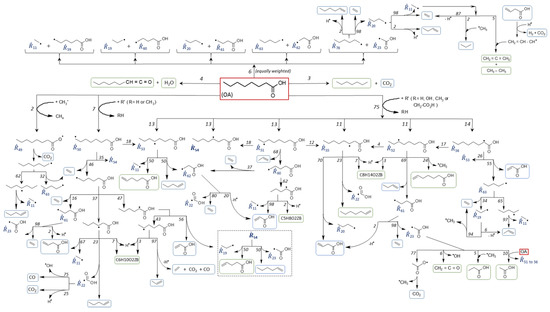 Overall scheme of octanoic acid (OA) pyrolysis as proposed in a previous work [13] on the basis of the experiments generated from the bench-scale setup detailed in this work (operating conditions of pyrolysis: 1 atm, 5% molar OA in N2, 421 ms residence time, oven set point temperature of 800 °C, tubular reactor axial coordinate 22 cm where temperature is 814 °C). Italic numbers indicate percent of parent species being converted to daughter species. C5H8O2ZB, C6H10O2ZB and C8H14O2ZB are globalized species considering isomers from which the major forms are, respectively: CH2=CH-CH2-CH2-COOH, CH2=CH-(CH2)3-COOH, and CH2=CH-(CH2)3-COOH.