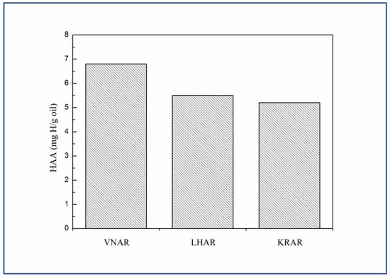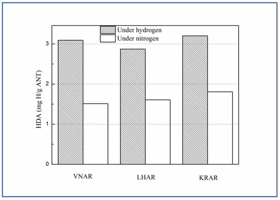In Figure 3, the HDA of the three residues under nitrogen presents an increasing trend of VNAR < LHAR < KRAR; the trend is completely opposite to their HAA. Higher HAA means lower HDA. However, the trend of HDA is different with the presence of hydrogen. The HDA of the VNAR system obviously increases, and is higher than LHAR, but lower than KRAR. By calculating the differences between HDA under hydrogen and under nitrogen, we can see that the difference values of VNAR, LHAR and KRAR are 1.581 mg H/g oil, 1.264 mg H/g oil and 1.395 mg H/g oil, respectively. The value of VNAR is much higher than the other two residues, which indicates that, minus the effect of the residue itself, hydrogen gas donates more hydrogen in the VNAR system. In other words, more hydrogen molecules are activated in the VNAR system. For LHAR and KRAR, the KRAR system can activate more hydrogen.