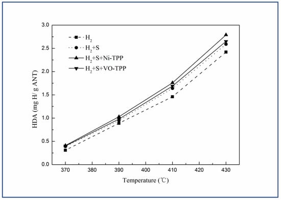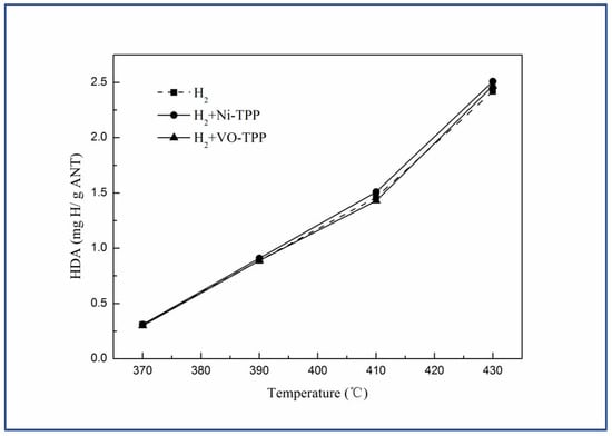 As shown in Figure 4, the activation capacity of hydrogen itself was increasing as the temperature increased. After adding Ni-TPP and VO-TPP, respectively, the HDA of the system was almost unchanged. This phenomenon indicates that the metalloporphyrin has no catalysis under the reaction conditions.
