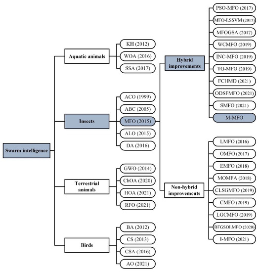 The classification of SI algorithms and variants of MFO.