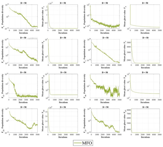 In order to perform a fair analysis and develop a better understanding of how population diversity affects the optimization process, Figure 3 illustrates the population diversity and convergence curves of the MFO side by side. For unimodal function F1, the diversity fell while the optimal solution had not been met yet. Hence, the algorithm sunk into the local optimum until the last iterations. For F3, the slope of losing diversity was not as sharp as F1, and the convergence trend continued until the last iterations. However, the population diversity was still low, and convergence speed was too slow to reach the near-optimal solution in the course of iterations. F4 and F7 represent the multimodal functions in which the MFO could not maintain the population diversity, and the algorithm experienced premature convergence, beginning at early iterations. F13, F18, F22, and F27 were plotted as representatives of hybrid and composition functions with similar diversity and convergence behaviors. The standard behavior was the effort of the algorithm to avoid the local optimum by increasing the population diversity; however, the simple movements of search agents in MFO could not satisfy the needs of exploration to escape the local optimum. To sum up, it can be concluded from the plots that the MFO loses its population diversity before reaching an optimal solution. This behavior was repeated for most of the functions, proving the deficiency of the algorithm in maintaining the population diversity.