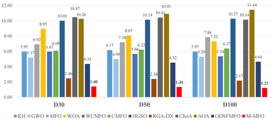 The M-MFO and competitor algorithms were implemented in Matlab 2020a. All experiments were performed 20 times, independently, on a laptop with Intel Core i7-10750H CPU (2.60 GHz) and 24 GB of memory to ensure fair comparisons. In each run, the maximum number of iterations (MaxIt) was set by (D × 104)/N where D and N were respectively set to the dimensions of the problem and 100. In this study, the CEC 2018 benchmark functions [116] were used to evaluate the effectiveness of the proposed M-MFO. There are 29 test functions in the CEC 2018 benchmark suite, each with its own set of characteristics and different dimensions 30, 50, and 100. These test functions can be classified into unimodal functions F1 and F3, multimodal functions F4–F10, hybrid functions F11–F20, and composition functions F21–F30. The experimental results tabulated in Table 2, Table 3, Table 4 and Table 5 and Table A1, Table A2, Table A3 and Table A4 in the Appendix A are based on each algorithm’s average and minimum fitness value, where the bold values illustrate the winning algorithm. Moreover, the symbols “W|T|L” in the last row of each table demonstrate the number of wins, ties, and losses for each algorithm.