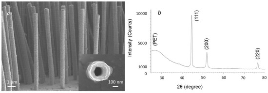 SEM image in (a) and XRD pattern in (b) of an array of Ni NTs in PET template. Similar results were previously obtained in [37,38].