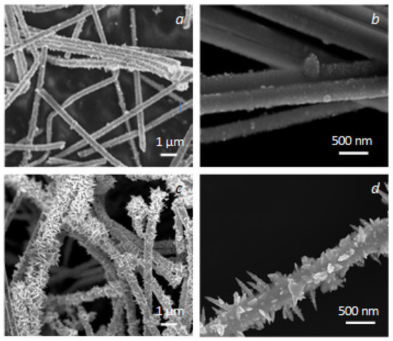 SEM images of Ni@Au NTs: (a,c)—prepared with gold chloride concentrations of 0.005 M and 0.01 M, respectively. (b,d)—the corresponding enlarged patterns.