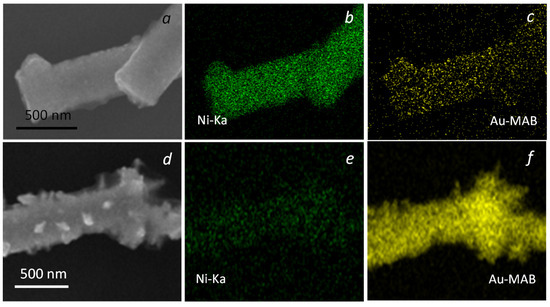SEM image (a,d), nickel and gold mapping (b,c,e,f) for Ni@Au NTs prepared with different concentration of Au 0.005 M (a–c) and 0.01 M (d–f), respectively. The images for 0.01 M concentration are similar to those published in [39].