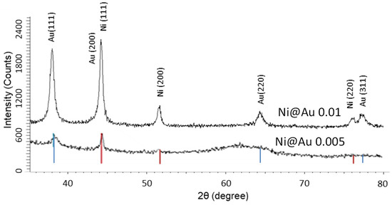 XRD of Ni@Au NTs with two concentrations of 0.005 M (bottom curve) [39] and 0.01 M (upper curve). The lower intensity peaks are due to smaller amount of NTs used for the investigation.
