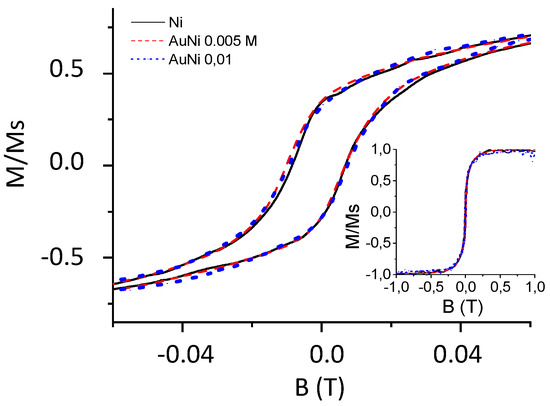 The hysteresis loops of Ni and Ni@Au NTs powder samples are shown in Figure 5. The loops are typical for ferromagnetic materials and correspond to previously obtained results for Ni NTs [38]. The magnetic properties: coercivity and squatness of hysteresis loops for samples of Ni and Ni@Au NTs are slightly different. Thus, the coercivity increases from 75 Oe for Ni NTs to 82 Oe for Ni@Au NTs (0.005 M) and to 87 Oe for Ni@Au NTs (0.01 M). The remanence to saturation value of about 0.315 is almost the same for all the samples. A change in magnetic properties of magnetic nanomaterials coated with functional layers is often observed, which is associated with surface effects, such as fixation of the magnetic moment due to the coating and a change in the interaction between particles [40]. In our case, the change was insignificant.