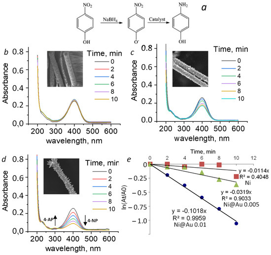 Catalytic reaction of the reduction of 4-nitrophenol by borohydride ions in an aqueous solution (a). UV-FTIR spectra of the reduction in the presence of Ni (b), Ni@Au 0.005 M (c), and Ni@Au 0.01 M (d). Kinetic analysis of the competitive reduction according to Equation (6) (e).