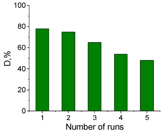 The reaction was tested in five cycles (runs), and the change in the reaction efficiency is shown in Figure 7. We observed at first a slight decrease in the efficiency of 78 and 65%, compared with the first run; however, after the fifth cycle, the reaction efficiency dropped to 48%, which could be due to a decrease in the amount of recovered material with the use of a magnet.
