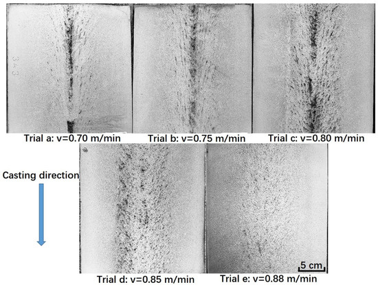 | Casting speed, m/min | 0.70 | 0.75 | 0.80 | 0.85 | 0.88 |