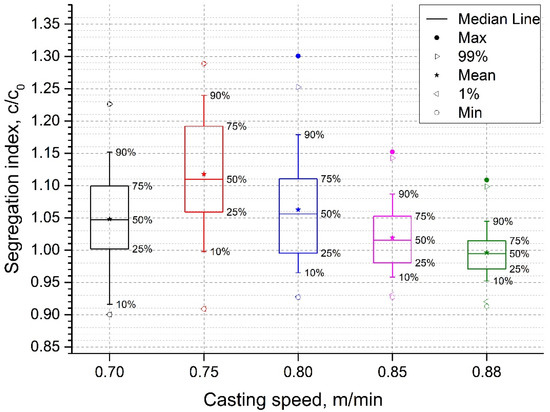 - Kojima, S.; Mizota, H. Quantitative analysis for center segregation of continuously cast slabs. Tetsu-to-Hagane 1983, 69, 263. [Google Scholar]