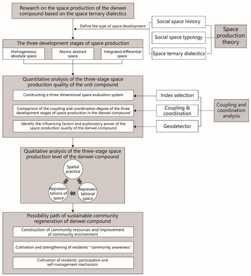 The community is the basic unit of urban social life and an important carrier of urban development and change. In the process of social transformation in China, urban communities have undergone profound historical changes: From the danwei compound model that dominated during the planned economy period [1] to the large-scale development of commercialized communities in the market economy period, and then the rise of the construction of livable residential areas during the period of high-quality development has promoted the great tide of urban community construction. In terms of function, the danwei compound centers on the “work” function of the danwei, organizing the living facilities and various welfare facilities within the danwei. In terms of space, “walls” are used to realize the enclosure, closure, and integrity, which form a spatial model of the integration of work and residence. Among them, the danwei refers to the enterprises, government institutions, and public agencies that provide urban residents with various employment opportunities [2], such as factories, schools, hospitals, government agencies, etc. In the period of a socialist planned economy, the danwei compound was the most basic form of social management and organization in Chinese cities [3]. However, due to historical and practical reasons, the traditional danwei compound has not received enough attention and has gradually fallen into a stagnant and declining development dilemma, facing the risk of being demolished, marginalized, or lowered. This not only troubles the daily life of residents in the danwei compound, but also becomes a major problem for the government’s community governance. This type of community has attracted wide attention from multiple disciplines such as urban planning, sociology, and management. During the political, economic, and social evolution of community structure, how can multiple forces (governments, danwei, markets, and residents) representing different interests participate in influencing space production at different stages? How can we build a harmonious and livable differentiated space and realize space justice? Based on Lefebvre’s theory of space production, this article combines a typical case of a danwei compound that has undergone a series of spatial evolution processes, conducts a qualitative analysis of the space production mechanism, performs quantitative analysis of coupling and coordination of space production in the different development stages of the danwei compound, and proposes possible paths for the livable and sustainable reconstruction of the danwei compound in the new stage.