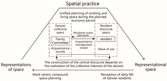 In the period of the danwei compound, the internal flow of personnel in the Supply and Marketing Cooperative Compound was almost static. It was based on the danwei system and the common working and living environment formed an acquaintance society [38]. Although there is a certain degree of social gap and spatial isolation outside the danwei compound, within the compound, the identity, status, production work, daily life, and leisure entertainment of the people are in a homogeneous, single, and stable state. However, it is different from Lefebvre’s absolute space; therefore, it is defined as “homogeneous absolute space” (Figure 2).