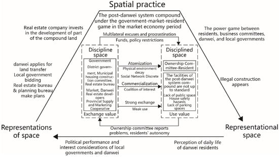 With the gradual deepening of the development of high-quality urban transformation, the “Danwei Compound” urban space production method constitutes the basis of Chinese current urban spatial transformation. The transformation plan of the original danwei compound “stock” to promote the healthy development of urban society has become the focus of research. First, with the help of Lefebvre’s space production theory, combined with the spatial transformation characteristics of its own structural form experienced by the Chinese urban danwei compound, the space production is divided into three stages, namely, the diversity-orderly type average space of the danwei compound system period, dispersed type abstract space of the commercial enclosed community period, and the integrated differential space of a livable community undergoing regeneration and transformation. At each stage, the government, market, and residents have different influences on time-space production. Secondly, using Hefei’s typical danwei compound as the research carrier, according to the space ternary dialectics, a multi-level analysis of “representations of space-representational space-spatial practice” is carried out on the production mechanism, and the logic of different types of spaces in different periods are described. Among them, the representations of space of the change of the danwei compound are the interrelationship of multiple governance subjects in different periods, such as changes in the implementation degree of governance strategies, the degree of residents’ community governance participation, residents’ satisfaction with community governance, etc. The representational space is the residents’ community perception and interpersonal relationship at different transition stages, Interpersonal trust, and other social relations’ changes. Spatial practice is manifested in changes in the support of public service facilities, public space, per capita living area, building quality, architectural style, and illegal building area. Finally, the three-dimensional space dialectical coupling coordination degree model is used to analyze and compare the representations of space of typical settlements in the three stages and the coupling characteristics of the representational space and the practice of space. On this basis, we provide innovative ideas and put forward relevant measures and suggestions for the regeneration, transformation, and development of livable areas.
