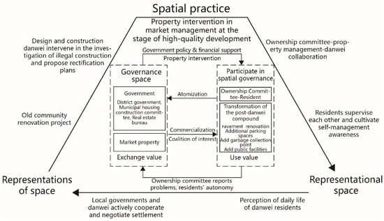 The behavior subject constantly interacts with the environment and, while the behavior is disciplined by the space, it also shapes the space [54]. At the level of spatial practice, some employee representatives who still live in the compound play games through the danwei with the local government. Residents occupy and transform space through their own subjective initiative, express their own demands, and highlight the contradiction between public and private space.