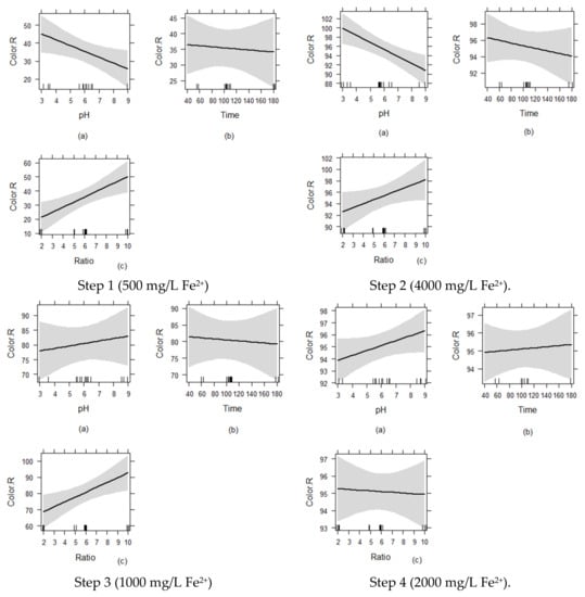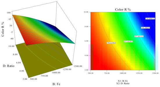 The polynomial model representing the response variable (color removal) was constructed based on the data presented in Table 4. Further, these data were used to prepare a regression model; the Y response was defined as a function of contact time (A), Fe2+ concentration (B), pH (C), and the H2O2:Fe2+ ratio (D). The proposed formula is as follows:
