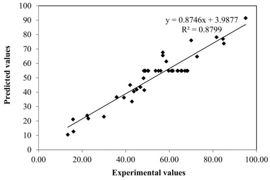 Fitting quality of a model could be judged by the coefficient of determination (R2). ANOVA results in this study present a high R2 value (0.9026) that is close to the adjusted R2 (0.8539) implying the applicability of the quadratic model. The closeness between R2 and adjusted R2 values suggests that the all terms included in the model were significant [30]. A model could not be assessed solely by R2, where a model with high R2 may still yield poor prediction. Thus, the predictability of a regression model could be assessed by R2 prediction, derived from the prediction error sum of squares (PRESS) [24,31]. Generally, our model was found to have better predictability according to the stated criterion when compared with others [26,32]. Table 8 presents a “Pred R-Squared” of 0.7156 which is in line with the adjusted R2 of 0.8539. Moreover, Adeq Precision was taken to measure the signal-to-noise ratio, where the value higher 4 is desirable. Herein, Adeq Precision of 19.156 was obtained indicating an adequate signal.