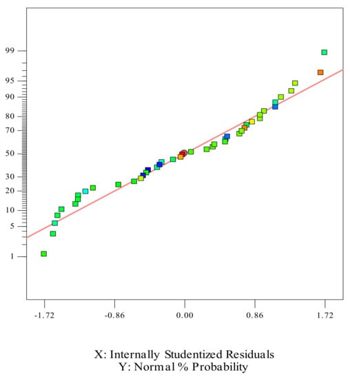 An analysis was conducted for the assumption of normality by preparing the plot of studentized residuals vs. the normal % of probability (Figure 3), revealing a satisfactory model towards color removal.