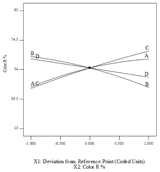 A perturbation plot was constructed for deeper identification of the most sensitive factors for leachate treatment. In this part, the perturbation plot for color removal was used to assess the response behavior as a result of deviation from the center point while the other factors were maintained constant. In the perturbation plot (Figure 4), the increase in reaction time (A) and pH (C) promoted higher color-removal percentage; therefore, the reaction time (A) and pH (C) yielded the most noteworthy positive effect on the color response. Increase in Fe2+ concentration (B) along with the ratio of H2O2:Fe2+ (D) decreased the color-removal percentage suggesting the negative effects on the decolorization.