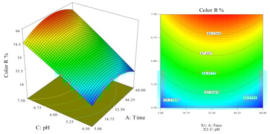 where Xi represents a dimensionless coded value of the ith independent variable, while X0 and ΔX are the center point value of Xi and step change value, respectively. To determine the correlation between the variables (X) and the responses (Y), a quadratic model was applied (Equation (2))—an adequate (second order) model. A linear model predicting the responses from entire experimental fields was also generated—approximating the interaction between the decolorization and the four independent variables [8]: