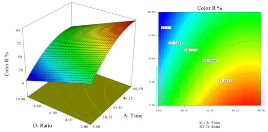 To obtain graphical illustrations of the regression equation the 3D response surface plot and 2D contour map were constructed in Design Expert 7.0 software analysis. The first-order effects, six interaction effects (AB, AC, AD, BC, BD, and CD) and four second-order effects (A2, B2, C2, and D2) were evaluated according to Equation (4).