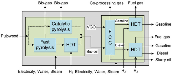 Figure 1 displays the co-processing, which contains the bio-oil production process and the co-processing process in an existing refinery.