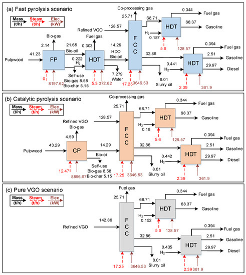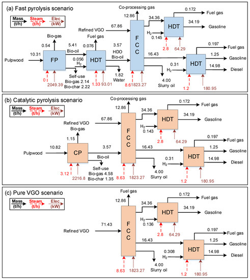According to Figure 3, the main differences between the two co-processing scenarios lie in the production process of bio-oil as well as the hydrogen consumption in the existing gasoline and diesel HDT units. In the fast pyrolysis scenario, 41.23 t·h−1 biomass is pyrolyzed in the reactor and then 14.29 t·h−1 bio-oil is obtained to be co-processed with 128.57 t·h−1 VGO. In total, 5.3 t·h−1 steam and 8570.24 kW electricity are consumed in the pyrolysis and HDT processes. In the catalytic pyrolysis scenario, 14.29 t·h−1 bio-oil is produced with the consumption of 43.29 t·h−1 biomass in the catalytic pyrolysis reactor. In total, 12.47 t·h−1 steam and 8866.67 kW electricity are consumed in the catalytic pyrolysis. The reason for the difference of hydrogen consumption of gasoline and diesel HDT processes in the two scenarios is the different oxygen contents of the HDO oil and catalytic pyrolysis oil.