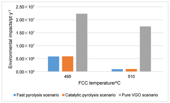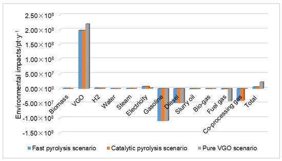 According to Figure 6, the environmental impact of VGO is 1.04 × 108 pt·year−1 and the VGO impact is the largest proportion among all the impacts for the fast pyrolysis scenario as well as the catalytic pyrolysis scenario with only 5% bio-oil co-processed with 95% VGO, while the VGO impact in the pure VGO scenario is as large as 1.1 × 108 pt·year−1. Similar to Case 1, the impacts of biomass and utilities can be ignored compared the large VGO impacts. The second largest contribution of the two co-processing scenarios is the electricity impact of 2.29 × 106 and 2.33 × 106 pt·year−1 while the electricity impact in the pure VGO scenario is 1.13 × 106 pt·year−1. As for the contributions of products, gasoline shows the largest contribution with 5.46 × 107 pt·year−1 while the bio-gas has the smallest contribution with 5.67 × 104, 1.21 × 105 and 0 pt·year−1 for the three scenarios, respectively. The total environmental impact of the fast pyrolysis scenario is 0.07% higher than that of the catalytic pyrolysis scenario. Thus, the optimal bio-oil production technology for Case 2 is the catalytic pyrolysis. The reduction of the total environmental impacts of the existing FCC and HDT processes can reach 73.6% with only 5% catalytic pyrolysis bio-oil added in the FCC feed.