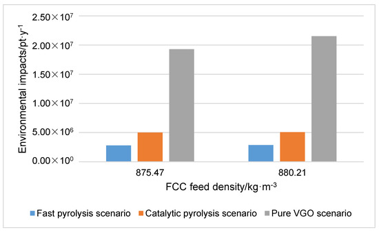 The effect of the FCC feed density on the environmental impacts was obtained according to the actual operating data of FCC, which is shown in Figure 8. The yields of all products of the FCC are listed in the Supplementary Materials.