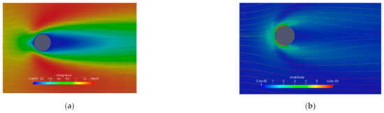 - Dennis, S.C.R.; Chang, G.-Z. Numerical solutions for steady flow past a circular cylinder at Reynolds numbers up to 100. J. Fluid Mech. 1970, 42, 471–489. [Google Scholar] [CrossRef]