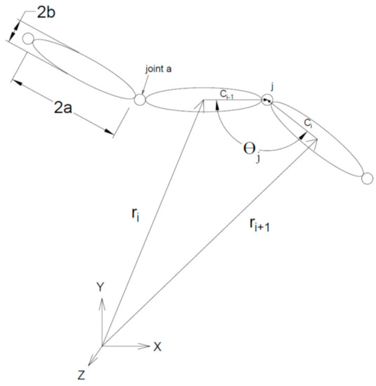 In Figure 4, the location of each segment is recognized by . The spheroid has a major axis, 2a, and minor axis, 2b. The segments are connected through a ball and socket joint, as illustrated in the figure. The connectivity of the fibres satisfies Equation (3).