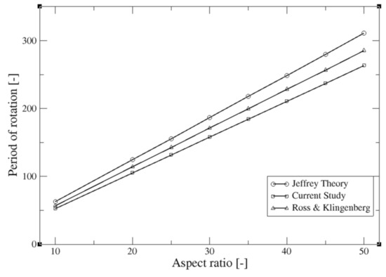 In Equation (31), is the non-dimensional period of rotation, is the shear rate, and is the aspect ratio. To do this, a single rigid fibre is simulated in a simple plane Couette flow, where the centre of the fibre is set at the middle of the domain. At this point, the translational velocity is equal to zero. Figure 6 shows the period of rotation for a fibre with 10 spheroids, where the aspect ratio has been changed in the range of 10–50. The results of the current study is in line with the Ross and Klingenberg theory [32] and the Jeffrey theory [32].