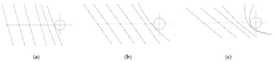 For the first case, the behaviour of a single fibre with three different flexibilities is observed, while the fibre initial orientation angle is varied. As shown in all plots in Figure 10, the fibre is carried by the flow, moves towards the cylinder, and touches the object. Depending on the rigidity of the fibre, the deformation of the cylinder can be varied. The fibre in Figure 10a is rigid, and its flexibility does not change when it contacts with the cylindrical object. For the other two fibres in Figure 10b,c, which are semi-flexible and fully flexible, the fibres deform. The initial orientation angle of the fibre has an important role of sliding off the fibre when the particle reaches the object. The larger the angle, the less sliding off can be observed in the figures. Even for the flexible fibre in Figure 10c, the inclination of the fibre can be seen when it reaches the cylindrical object. For the flexible fibre, bending of the fibre segment has been fully captured by the model as the fibre gets hung-up by the cylinder and all joints of the fibre segment react to the forces, and momentums is applied by the flow field around the cylindrical object.